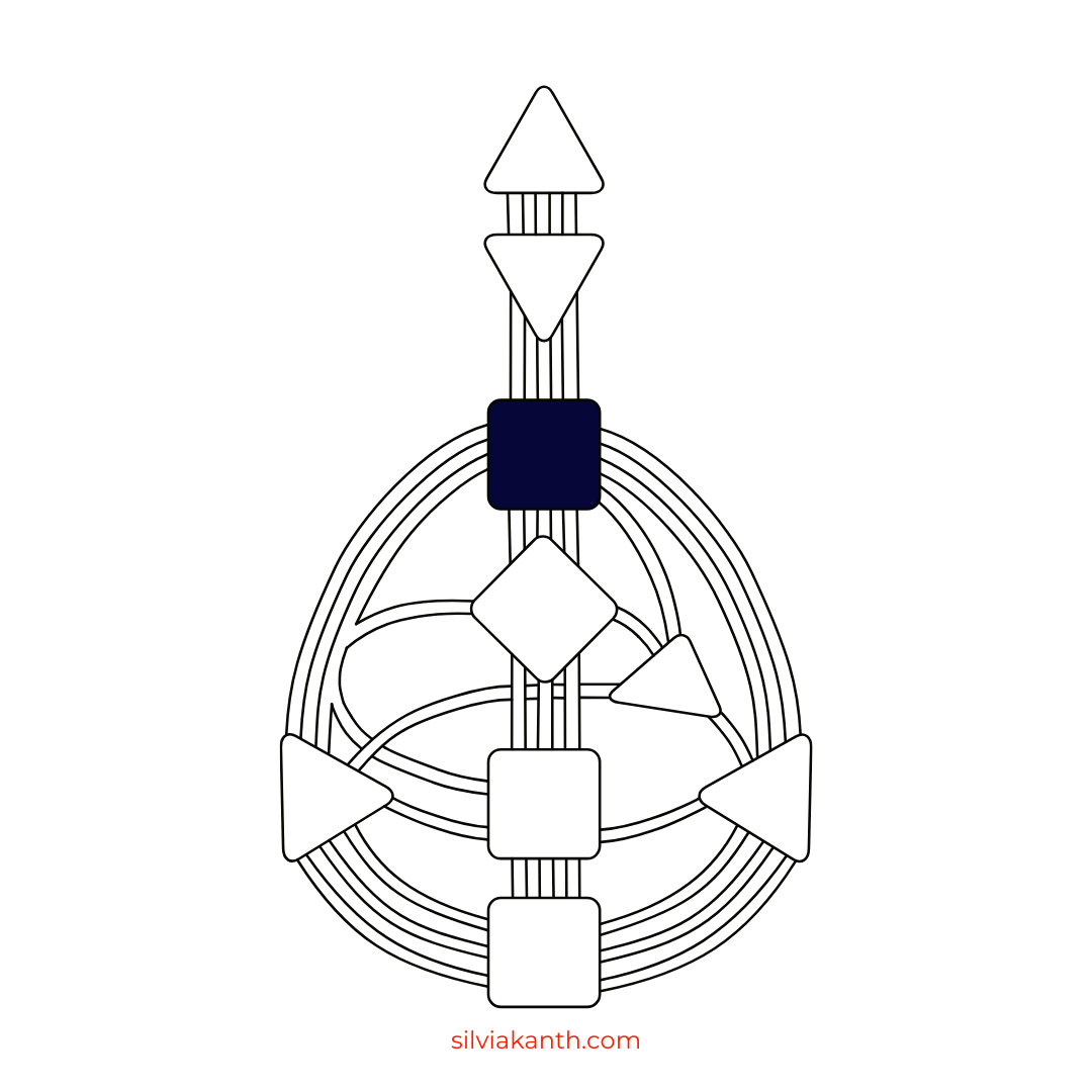 Hier siehst du ein Human Design Chart. Das markierte Zentrum ist das Kehlzentrum. Die Linien, die zu diesem Zentrum führen, heißen Kanäle. Je nachdem, von welchem Zentrum diese Kanäle kommen, hast du eine andere Art zu kommunizieren.